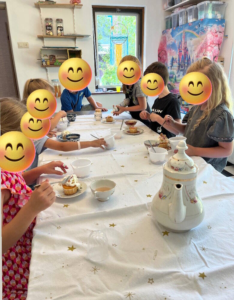 Na het cadeautjes uitpakken met het muziekspel, koninklijke ranja drinken was het tijd om de handspiegeltjes te versieren met foamklei. Voor de 2 jongens had John 2 zwaarden gemaakt. Ook deze werden versierd met foamklei en decoraties.