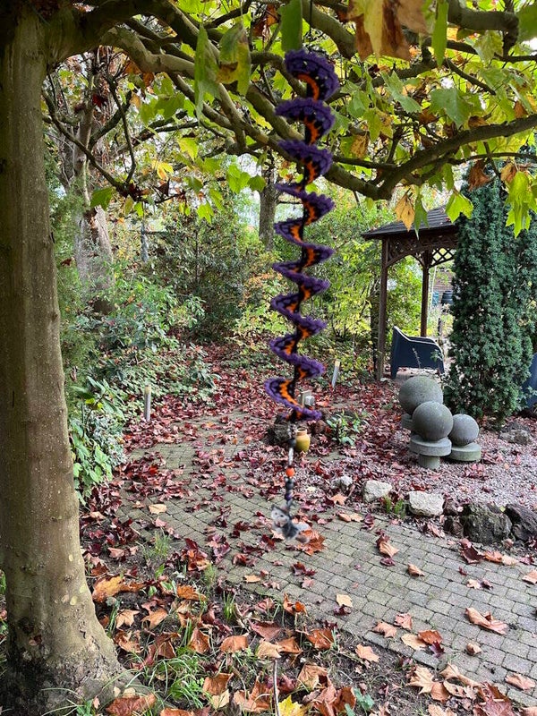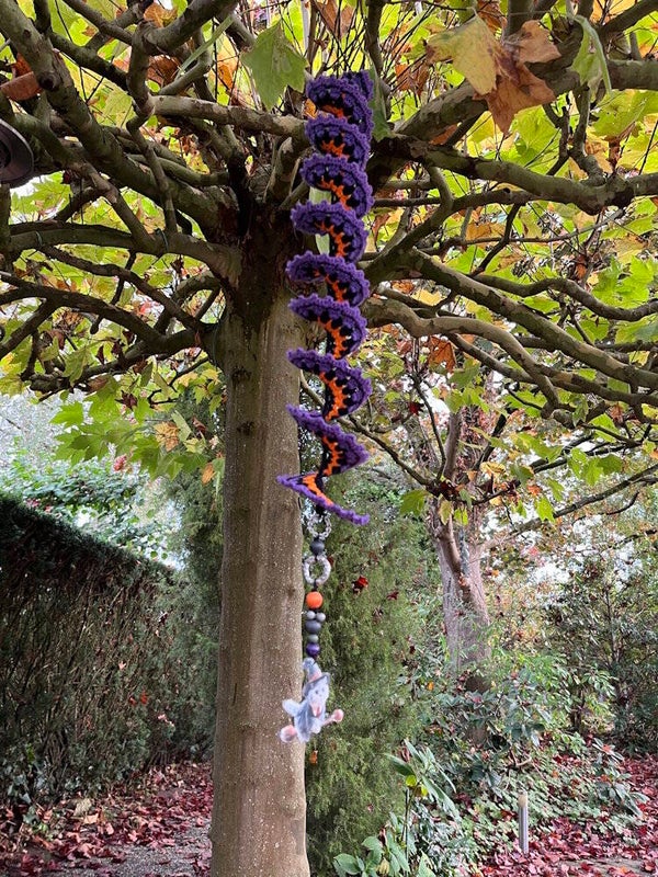 Deze windspinner is gehaakt met katoenen garen in de kleuren violet, zwart en oranje.