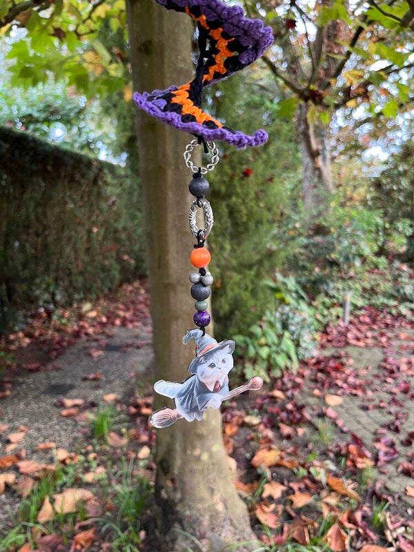 Onder de windspinner hangen houten kraaltjes, metalen kraaltje en ringen en een hanger met kat op bezem.