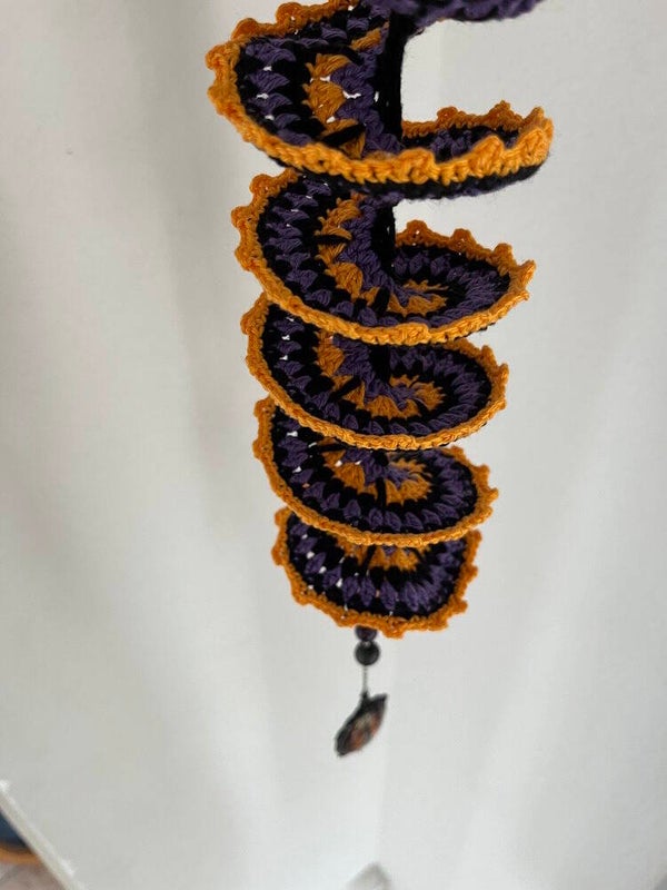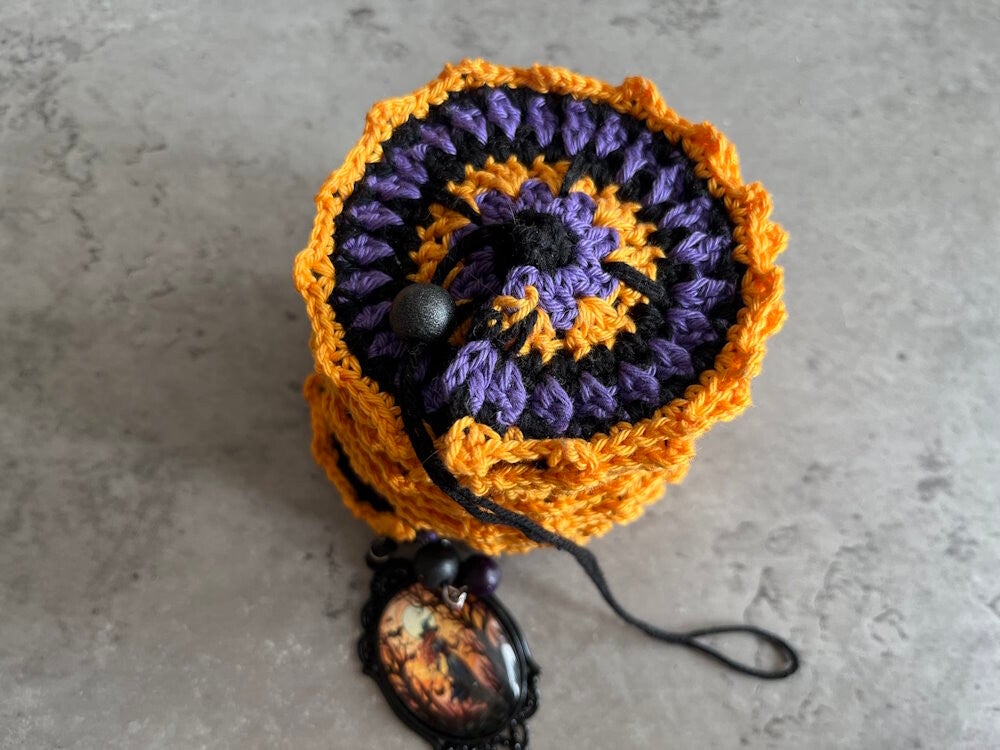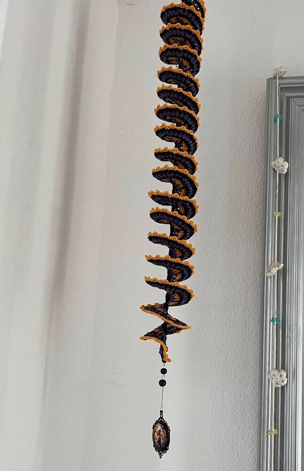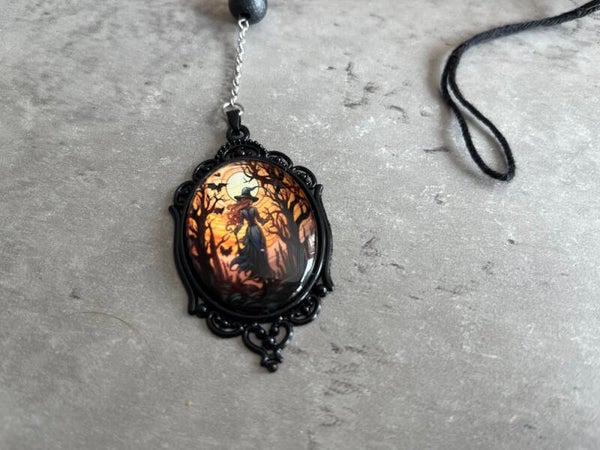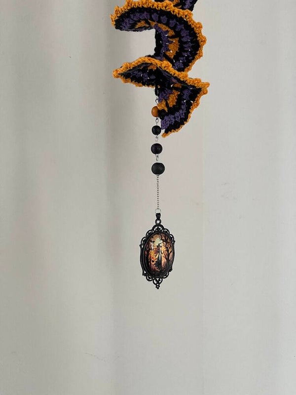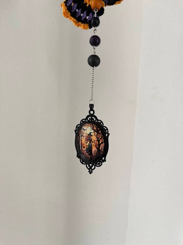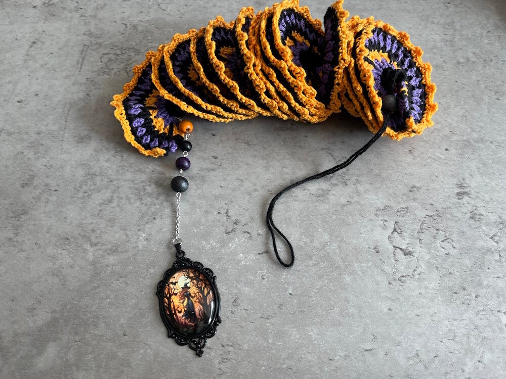 Windspinner Halloween Heks Medaillon is gehaakt met katoenen garen. Versierd met houten kralen en een medailon met heks.