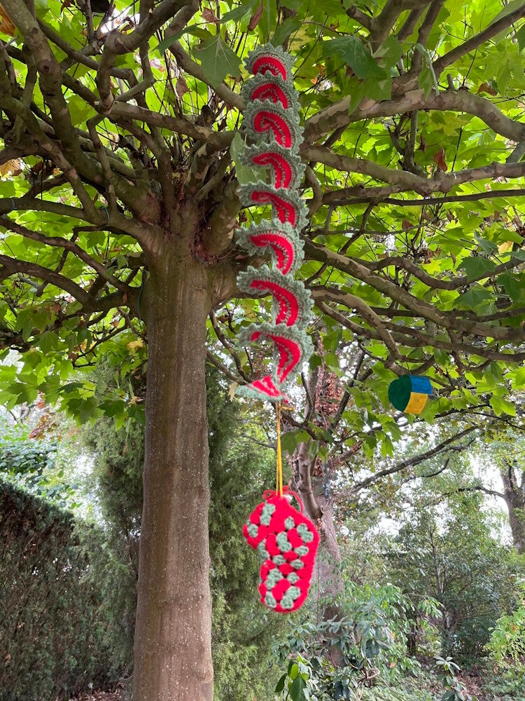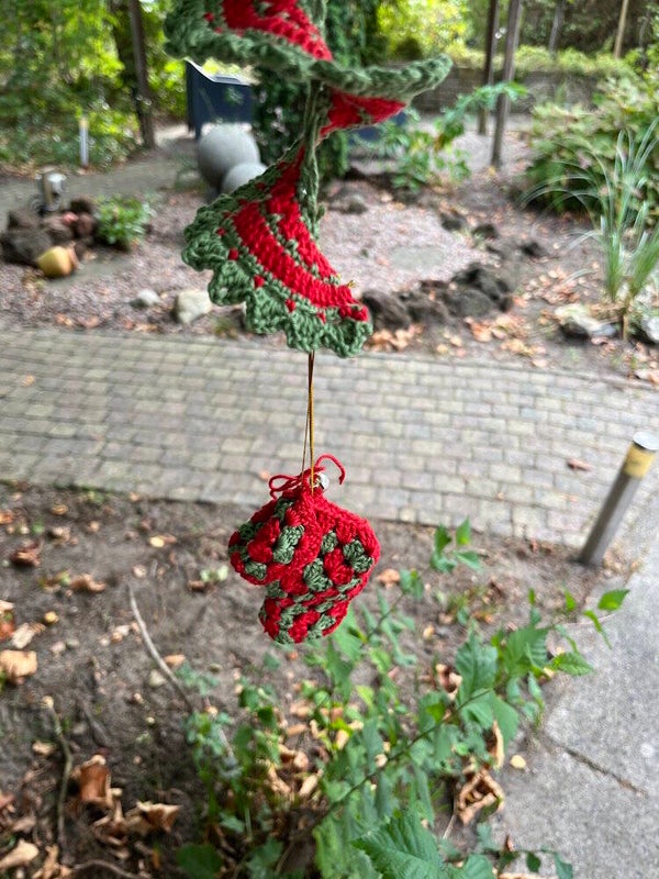 Deze windspinner is gehaakt met 100% katoenen garen in de kleuren groen, rood en gouddraad. Met een gehaakte kerst sok en rinkelbelletje.