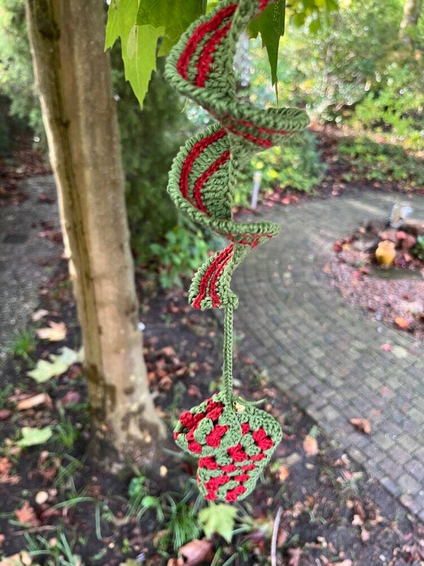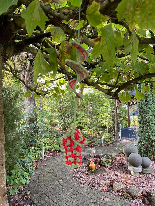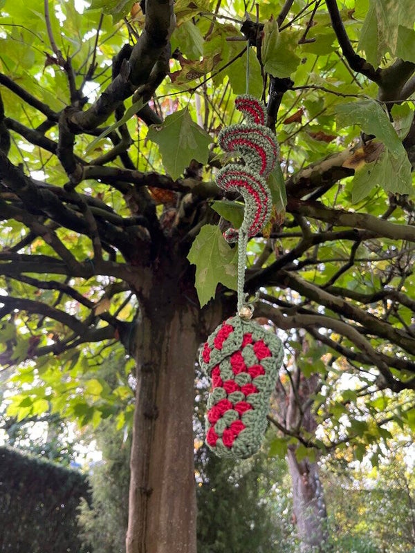 Deze windspinner is gehaakt met 100% katoenen garen in de kleuren groen en rood. Met een gehaakte kerst sok en rinkelbelletje.