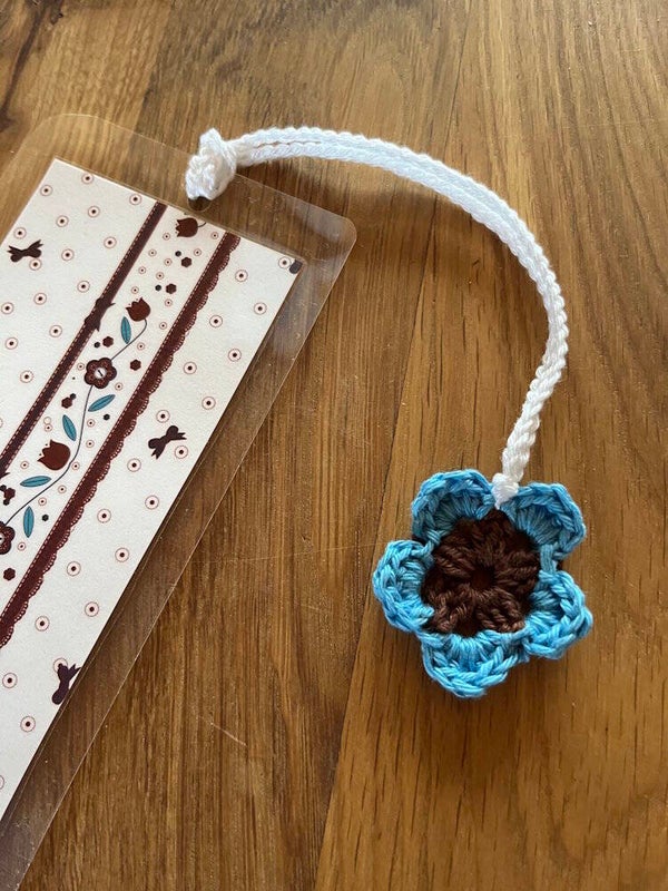 Boekenlegger met gelamineerd decoratiepapier en gehaakt koordje met bloemetje.