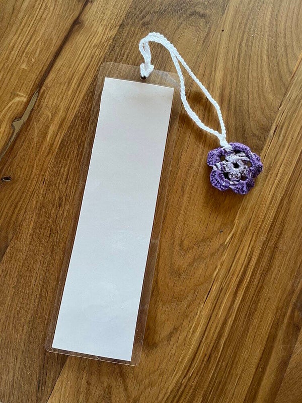 Boekenlegger met gelamineerd decoratiepapier en gehaakt koordje met bloemetje.