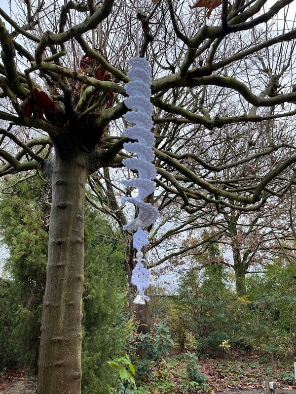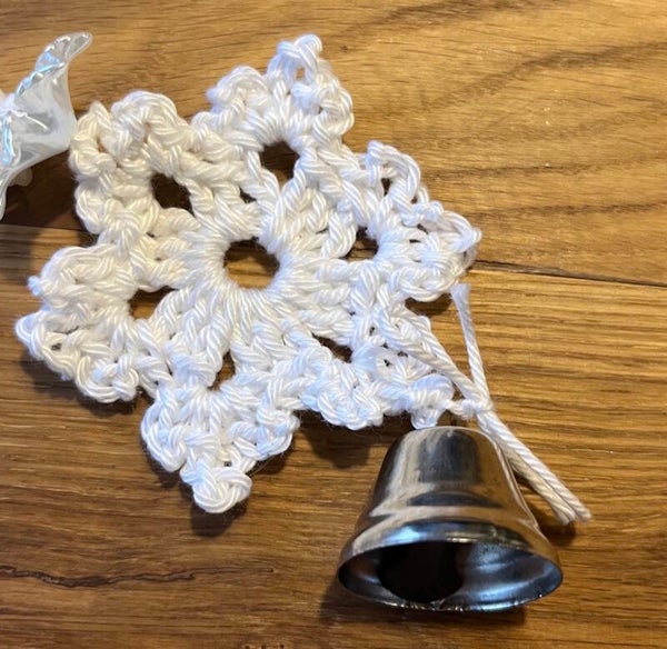 Deze windspinner is gehaakt met 100% katoenen garen in de kleuren wit met zilverdraad. Met gehaakte sneeuwvlokjes en kralen er onder en een rinkelbel