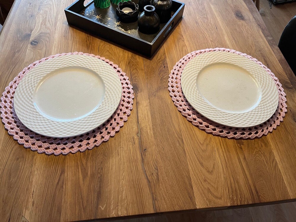 Placemat in soft rose, powder pink and gold colour. They're crocheted from 100% cotton yarn. The gold colour is polyester