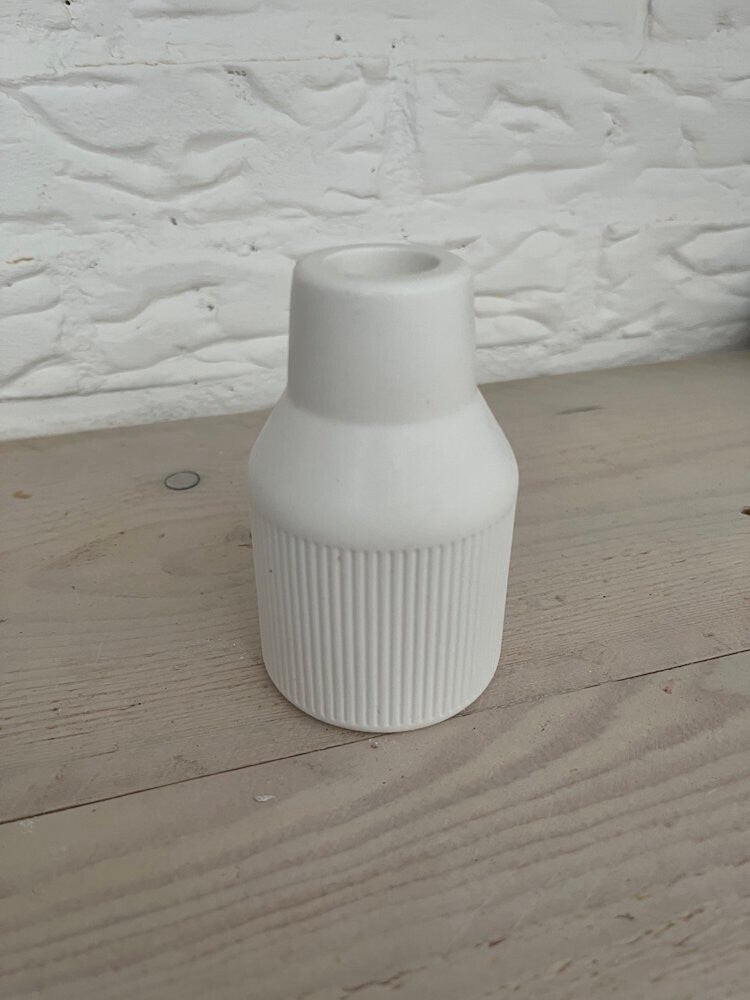 Dit vaasje van gips is strak maar toch ook een beetje speels dankzij de streepjes en randje.